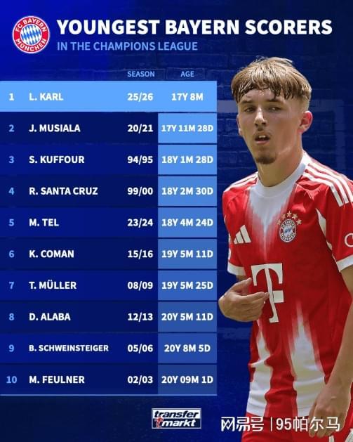 这不是卡尔第一次抢流量。10月欧冠拜仁对阵布鲁日,他以17岁242天的年龄成为拜仁欧冠队史最年轻进球球员;11月德甲对阵弗赖堡,他以17岁273天的年龄,成为拜仁队史德甲单场传射建功最年轻的球。